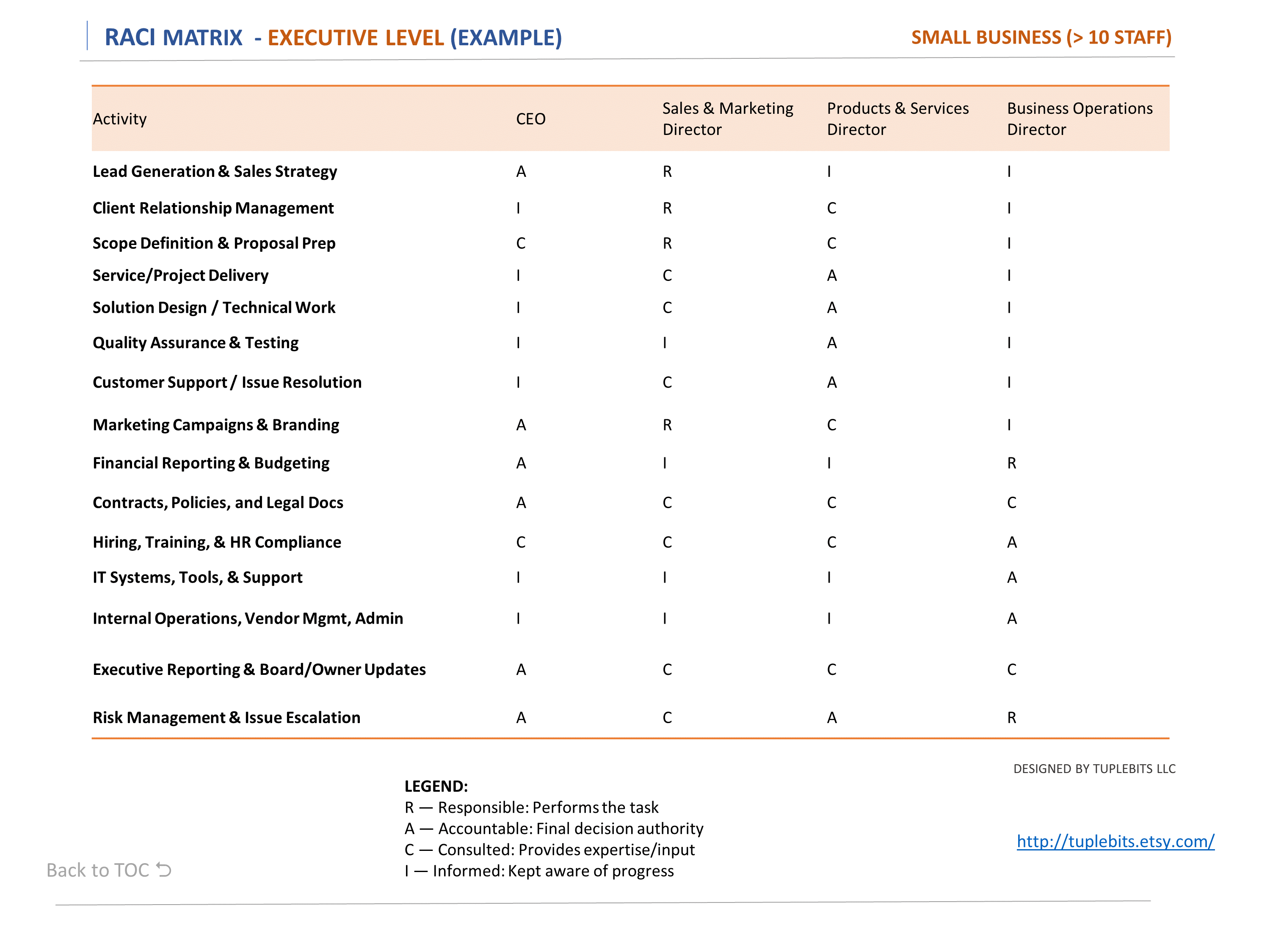 - Top-level RACI matrix examples for each scenario